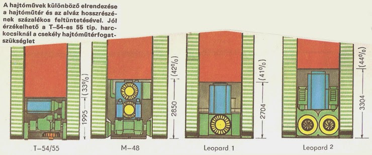 Otóż dobrym przykładem na to jaką oszczędność miejsca daje silnik umieszczony poprzecznie są moje ulubione pojazdy- czołgi. Przykładowo, taki T-54/T-55 ma znacznie, ale to znacznie krótszy przedział napędowy od T-34, choć oba wozy mają praktycznie taki sam silnik. Zresztą, poniżej ciekawy rysunek. Widać jak krótki jest przedział napędowy przy silniku umieszczonym poprzecznie, a jak długi przy silniku umieszczonym wzdłużnie (silnik zaznaczono kolorem niebieskim).